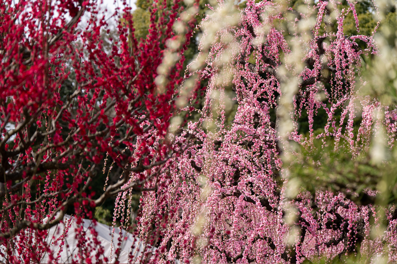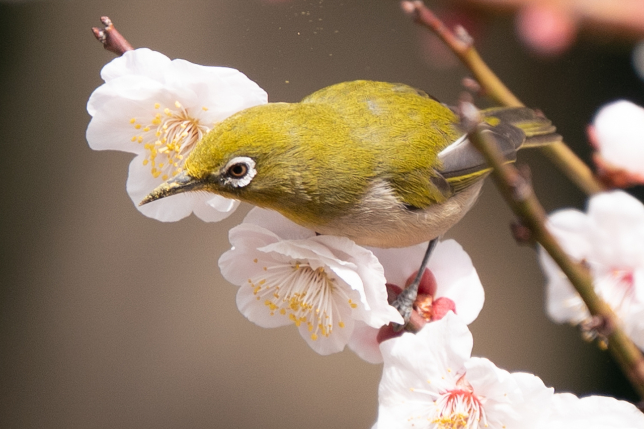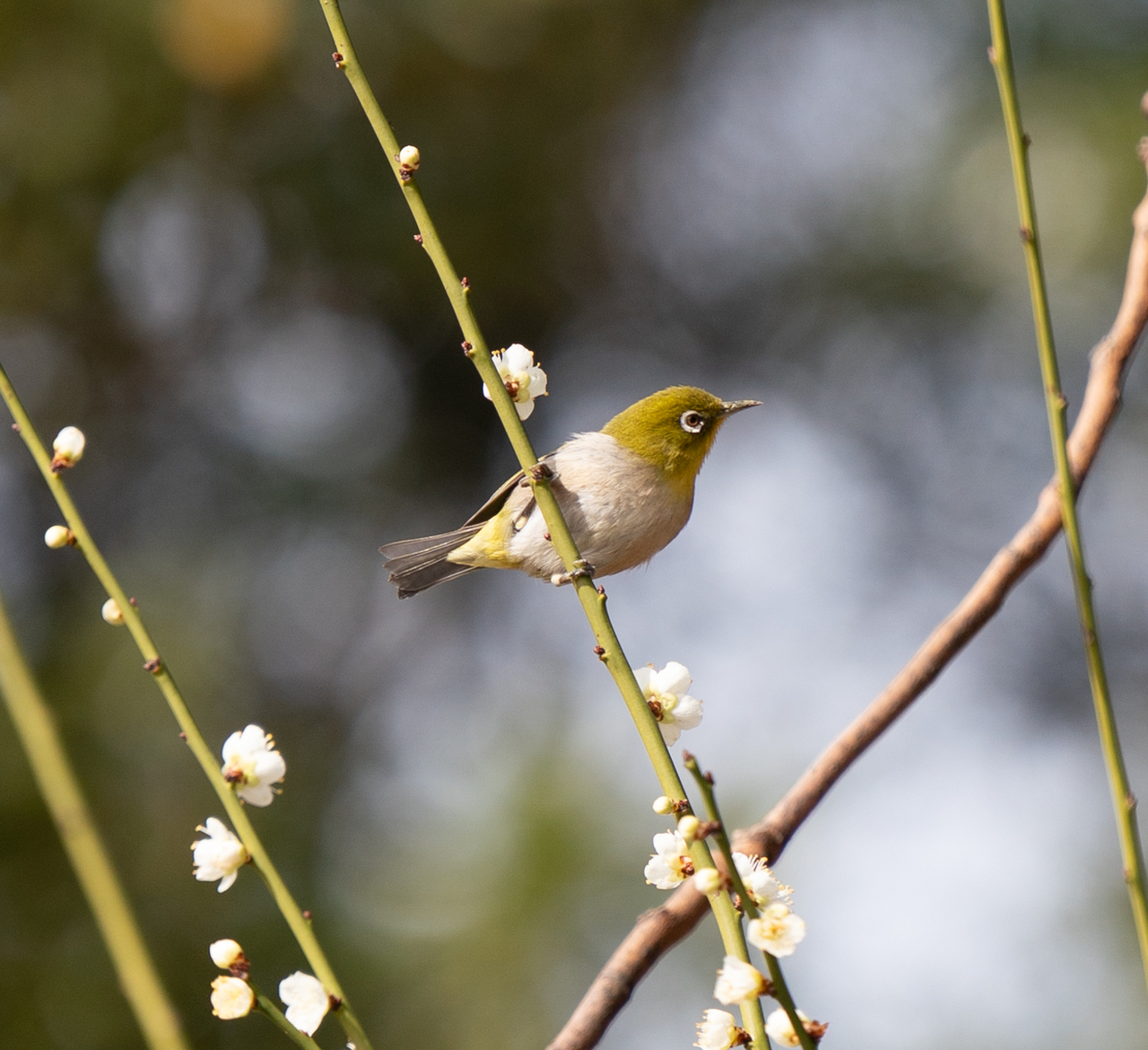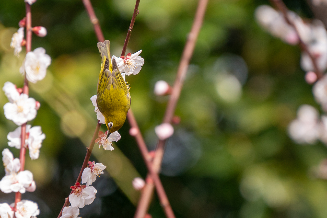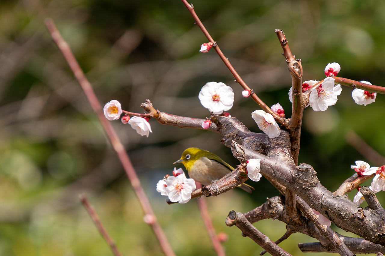 こじんまりした梅園に高密度で梅が咲き誇り最高です。メジロは朝の食事を終えると