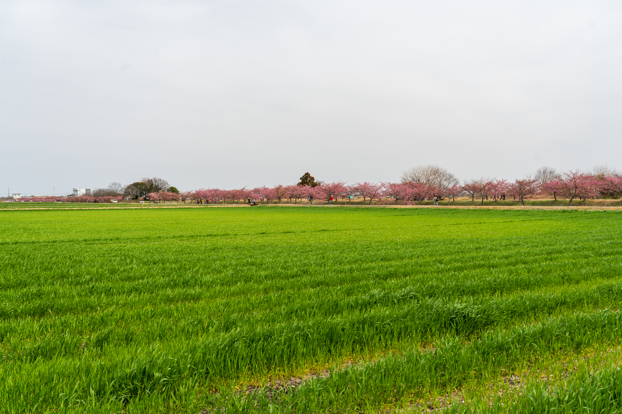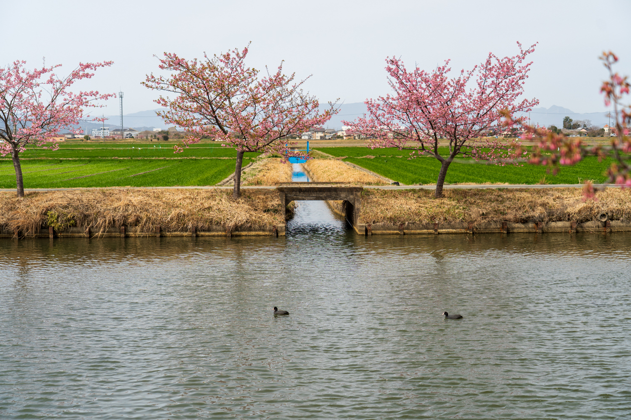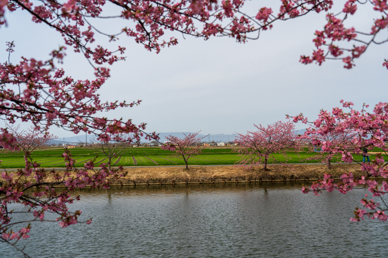 のどかな田園の緑に生えるピンクの河津桜(笠松河津桜ロード)
